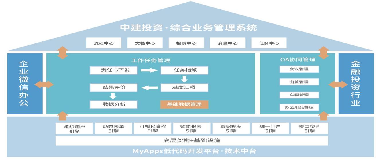 爱游戏的解决方案:天翎myapps低代码平台通过深入的调研和以往的经验,为中建投资打造第一期以oa协同和工作任务管控为主的综合业务管理系统。
