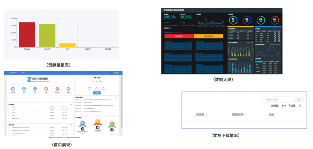 企业员工的文档发布、文档上传、浏览量、下载等数据的展现形式多样化,可以通过贡献量报表、数据大屏展示数据情况,方便管理者了解自己企业的情况,做出合理的决策。