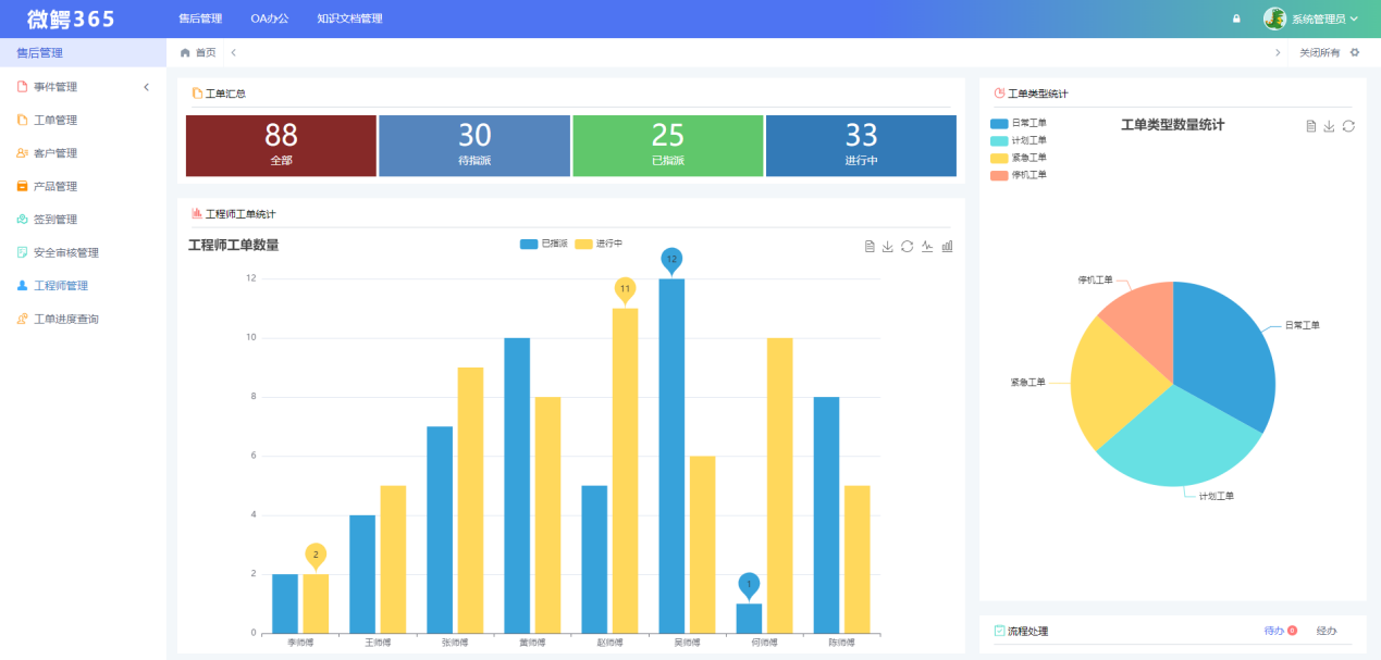 5. 工程师管理:了解当前工程师的工作状况,可以更好的分派维修工程师工单。